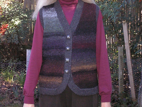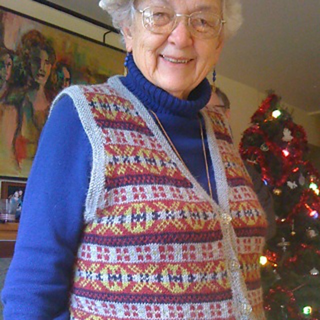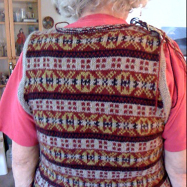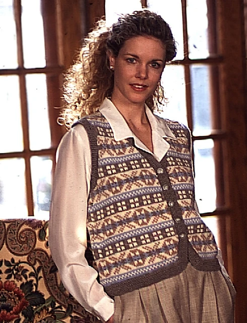 | Retrovest (fra 1996), som er moderne igen, i 4 farver i mønsterstrik (Fair Isle). Den strikkes nedefra. Der er et stort diagram over mønstret. Her er den strikket i 100 % uld på pinde 4 og 4½ mm. |