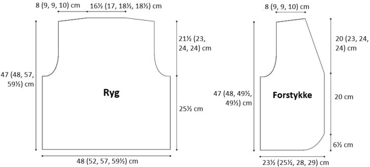 21½ m/24 p = 10 x 10 cm på de tykke pinde i mønsterstrik.