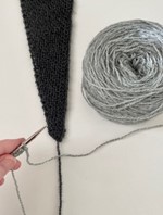 | Flot sjal i glatstrikning i 2 farver. Det bygges op af 2 lange trekanter, der strikkes sammen undervejs. Man kan veksle mellem de sider, der vender udad. Her i uld på pinde 4 mm. |