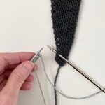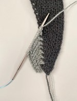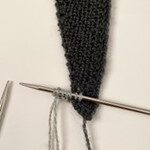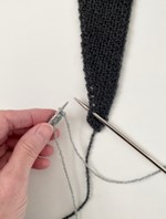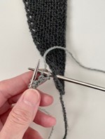 - P 1 (rets): Stik højre p forfra ind i næste omslag, 2 r, træk kantmasken over de 2 m, du lige strikkede, slå om, strik ret til de sidste 4 m, 2 r dr sm, 1 dr r, 1 løst af med garnet foran.