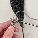 - P 3: Stik højre p forfra ind i det første omslag, 2 r. træk kantmasken over de 2 m, du lige strikkede, slå om, 2 r, 1 dr r, 1 løst af med garnet foran = 7 m.