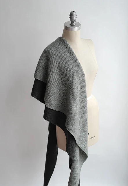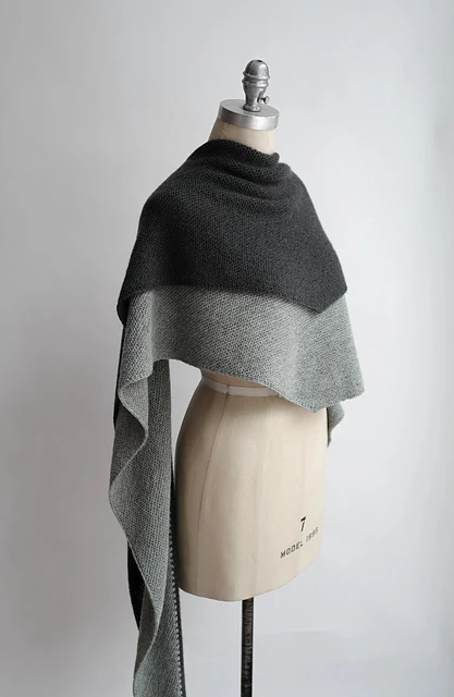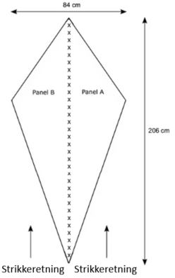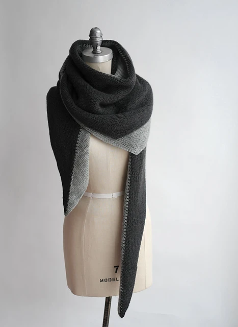 Dette sjal er et smukt og anvendeligt tilbehør, der laves ved at strikke 2 lange trekanter som modulstrik. Når du har strikket den første, fastgøres den anden til den første, mens du strikker. Der er ingen vendepinde, kun udtagninger og indtagninger. Når trekanterne er færdige, folder du sjalet langs midtersømmen og beslutter, hvilken farve du vil have udad den dag.