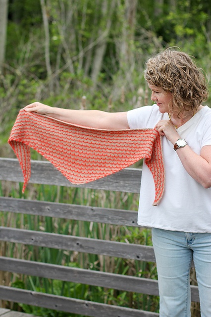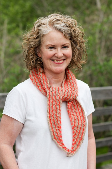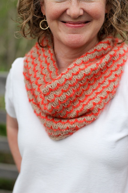 Lang halsvarmer, der kan nå 1 eller 2 gange om halsen. Den er strikket i en slags vævestrik, og mønstret over 8 pinde er let at lære udenad.