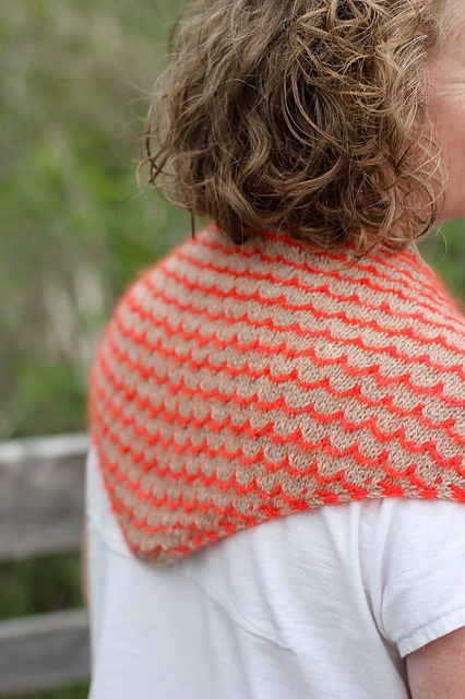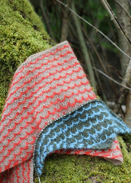 | Flot bandana i en slags vævestrikmønster. Det er kun de 2 mønsterpinde, der er lidt kringlede, ellers er det i glatstrikning. Her i uld, cashmere, alpaca og silke på pinde 4 mm. |