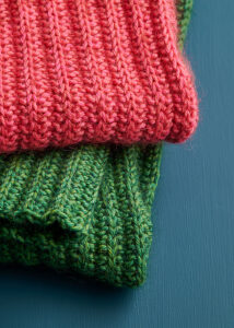 B: Purl Soho Tussock (60 % superfin kid mohair og 40 % morbærsilke; 300 m/25 g); Garnforbrug ca. 2.000 m); farver: Cypress Green og Anjou Pear; 7 ngl.