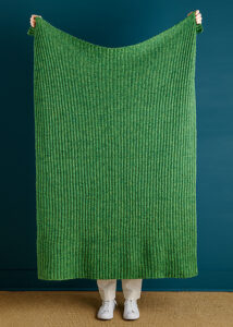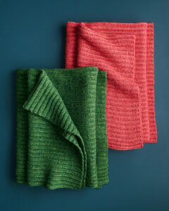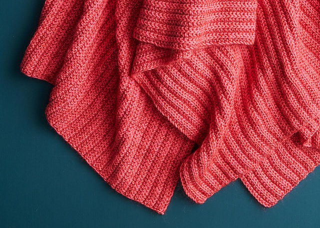 Dette lille tæppe til en eftermiddagslur strikkes af 2 typer garn, der holdes sammen: merino (DK) og mohair + silke (fingering).
