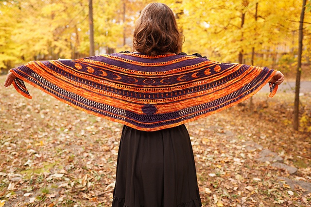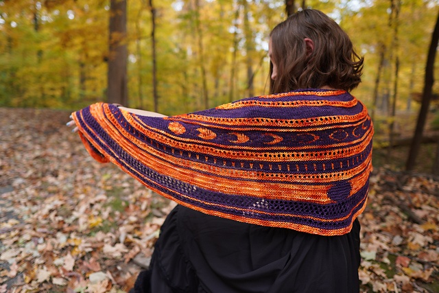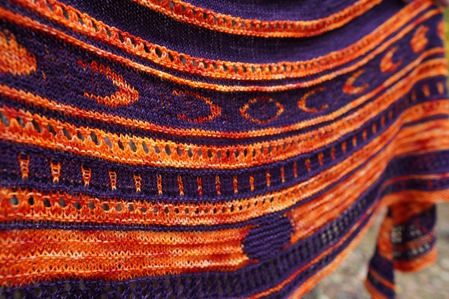 Dette halvmåneformede sjal viser udviklingen af en solformørkelse. Der bruges mønsterstrik, intarsia og rækker med enkle hulmønstre kom kontrast.