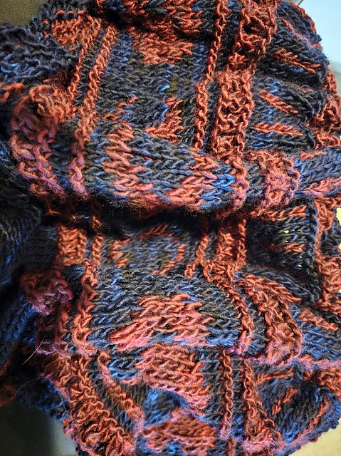 Jeg brugte Rebel Purl ”4 Plies of the Apocalypse” (75 % merino, 25 % nylon; 399 m/100 g); garnforbrug: G: 279 m/70 g og K: 327 m/82 g; farver: (G) Mistress of the Dark (mørklilla) og (K) farveskiftegarn i rød/orange (398 m/100 g).