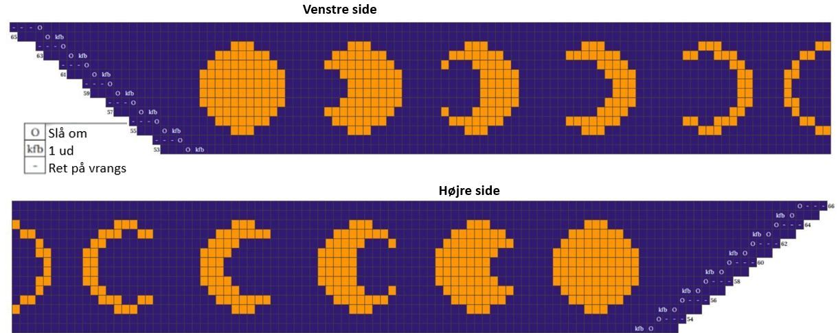 | Skønt, stort sjal med billeder af solformørkelse i forskellige stadier. Der bruges mønsterstrik og intarsia. Her strikket i uld og nylon i 2 farver på pinde 3½ mm. |
