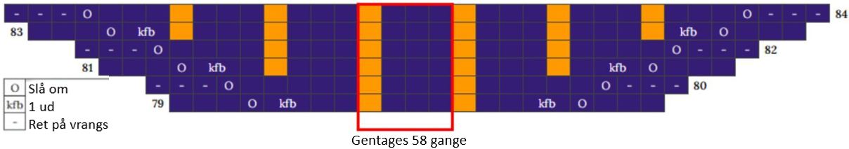 - P 85: 3 r, slå om, 1 ud, strik ret til de sidste 4 m, 1 ud, slå om, 3 r.