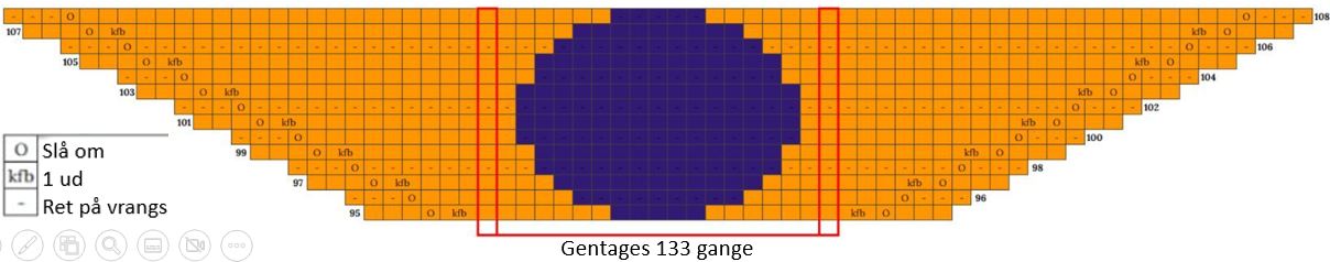 - P 95-108: Med intarsia følger du Diagram C og forts med udtagninger i starten og slutningen af alle p = 335 m. Bemærk dog: