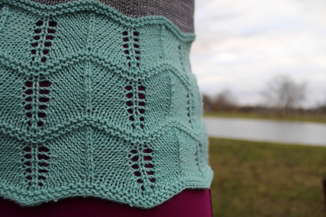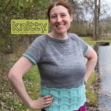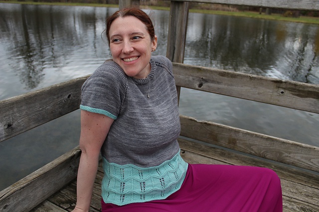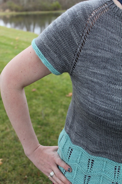 Efter bærestykket sættes ærmemaskerne på en holder, mens du strikker kroppen. Det nederste stykke er et bredt chevron-hulmønster, her i kontrastfarve. Toppen kan også strikkes ensfarvet.