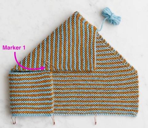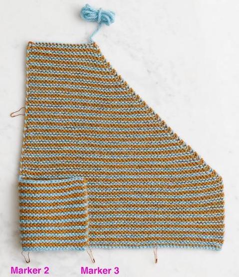 - Med et nyt stykke af A på 30 (30, 30, 45, 45) (45, 60, 60, 60) cm strikker du fra højre mod venstre. Sy med kastesting fra folden til markør 1.