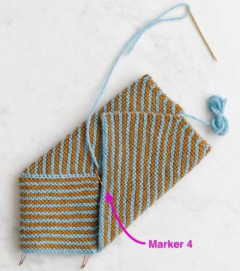 - Forts med det samme garn, som du brugte til den forrige søm og sy med et kastesting fra markør 4 til markør 3 (se bill.). Forts derpå langs nederste kant fra højre til venstre og sy opslagsmaskerne sm fra markør 3 til markør 2 (se bill.).