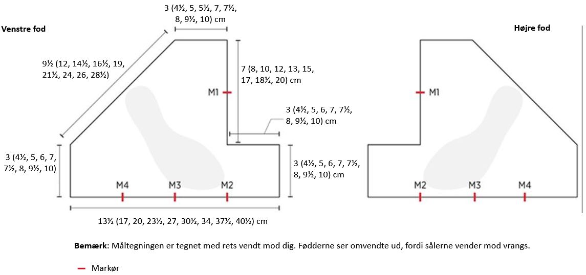 Bemærk: Højre fod strikkes på samme måde som venstre, blot modsat.