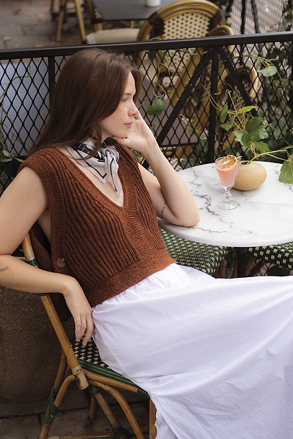 Ulrika Natur (100 % uld; 100 m/50 g); eller Ulrika (100 % Superwash uld; 100 m/50 g); eller Tencel Blow (58 % Tencel™ lyocell, 42 % alpaca; 100 m/50 g); farve: 327006 Chestnut Nature; garnforbrug: ca. 250 (280, 310, 340, 370, 420, 470, 520) g.