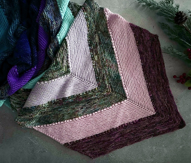 Sjovt og nemt, retstrikket sjal, som kan strikkes af garnrester eller mininøgler. Det ligner en indpakket gave.