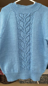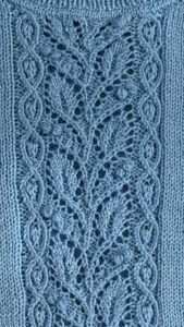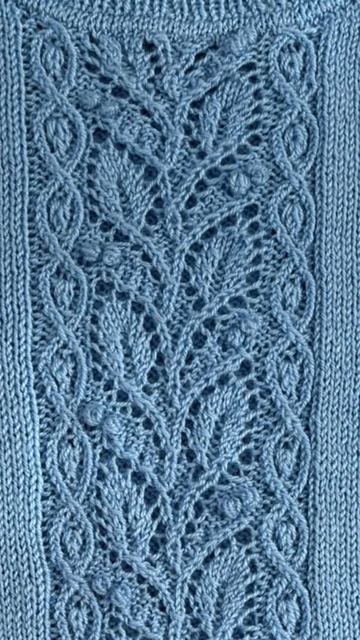 | Kortærmet bluse med smukt hulmønster ned foran og raglanærmer. Den er lidt kompliceret, men der er gode videoer på YouTube. Her strikket i akryl, men andet kan vælges. Pinde 3 og 4 mm. |