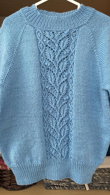 - Omg 1: *Strik ret til markør, strik raglanm, strik ret til markør, strik raglanm, 1 ud venstre*. Strik fra * til * i alt 2 gange, samtidig med at du indarb maskerne i hulmønstret på ærmerne. Strik ret omg ud = 4 m taget ud.
