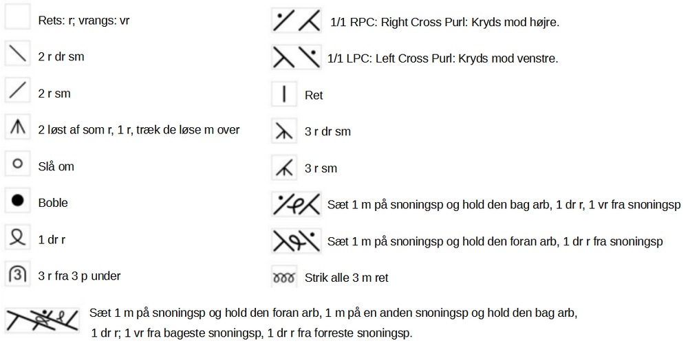 Boble: Med hæklenålen trækker du en løkke op, slår om, trækker endnu en løkke op, slår om, trækker en tredje løkke op, slår om og trækker hæklenålen gennem alle 5 løkker. Træk nålen igennem masken endnu en gang og lad boblen falde af venstre p, træk nålen bagud og gennem lænken under den løse m sm med sidste m på nålen. Sæt masken på højre p.