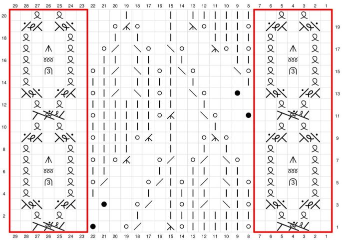 - På raglanp og vendep begynder du at forberede hulmønstret på str S omg 5, str M omg 7 og str L&XL omg 9. Det betyder, at afhængigt af din str vil du kun strikke vrangm i sidemønstrene i kanten. Selve hulmønstret starter på omg 10 efter vendep. (Se hulmønsterdiagram.)