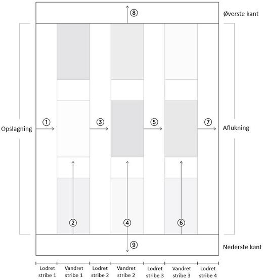 - (G): Strik 1 m op ml alle retriller langs kanten af de Lodrette stribesektioner, og 1 m op for hver m langs de Vandrette stribesektioner = 172 (187) m.