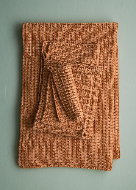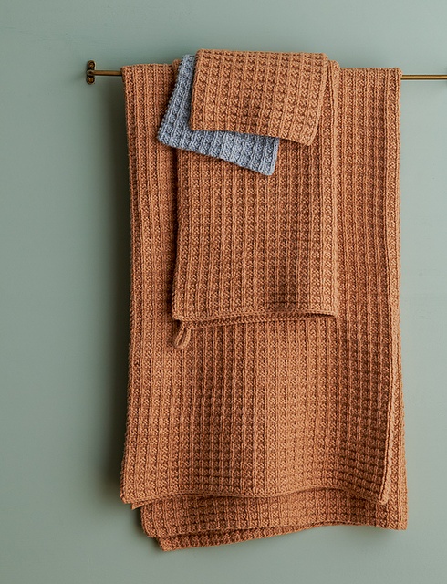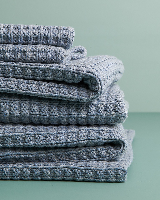 | Dejligt sæt i bomuld og hør. Det er i 3 størrelser og består af vaskeklud, gæstehåndklæde og badehåndklæde i et absorberende vaffelmønster. Strikket på pinde 4½ mm. |