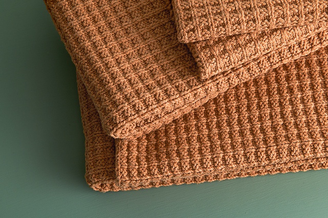 Disse håndklæder strikkes i bomuld og hør, som er perfekt til den vaflede, elastiske tekstur. Det er meget absorberende. Der er 3 størrelser: vaskeklud, gæstehåndklæde og badehåndklæde.