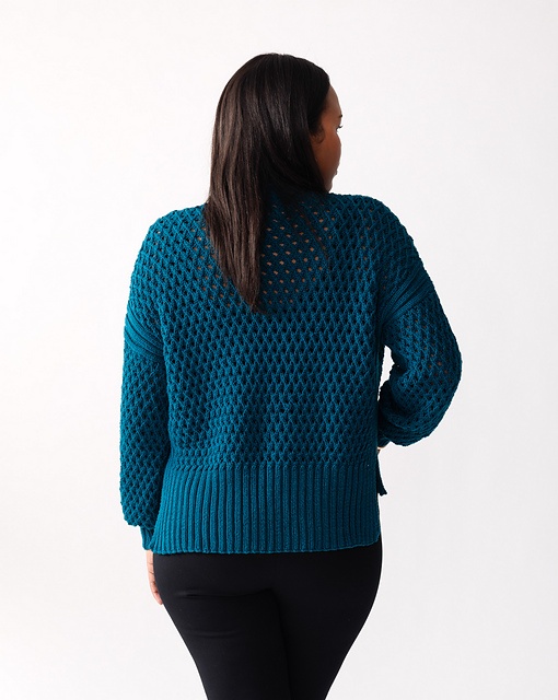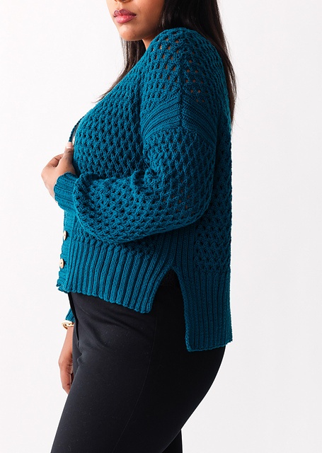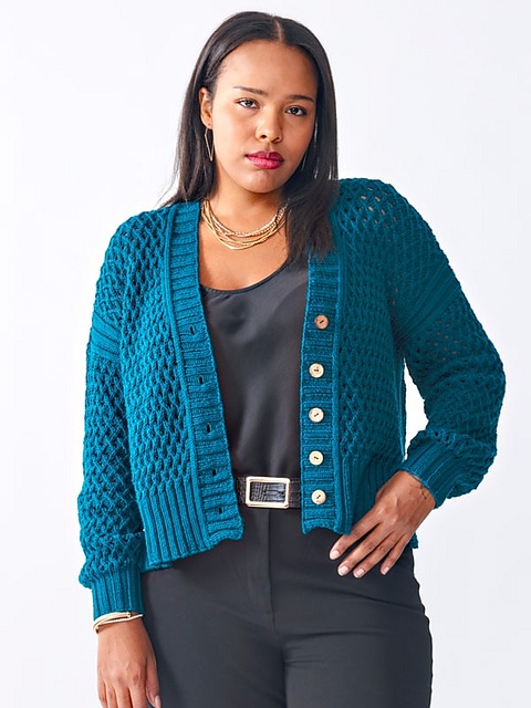Denne elegante cardigan med knapper har et smukt gittermønster, der laves med små huller og drejede masker.
