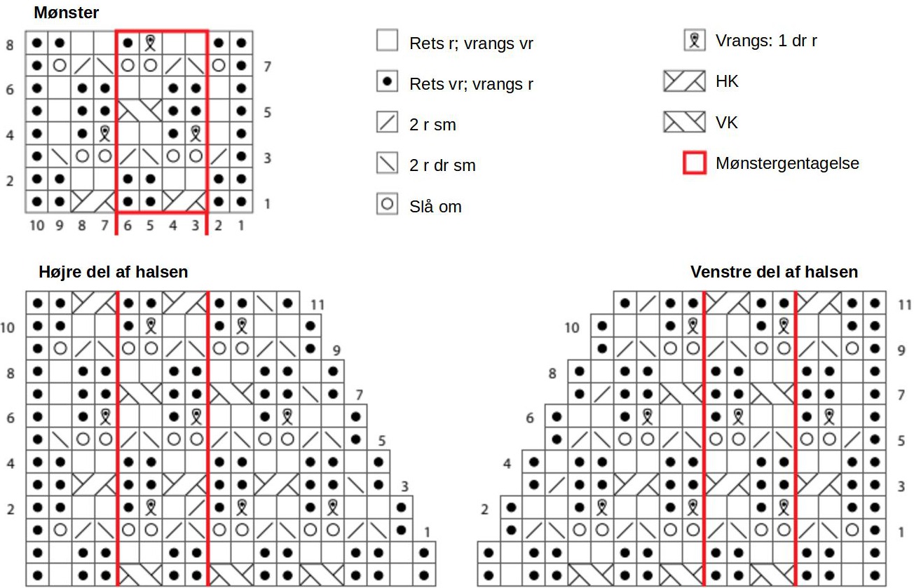 - P 4: 1 r, 1 vr, *strik (1 r, 1 dr r) i det dobbelte omslag, 2 vr*. Gent fra * til * til de sidste 4 m, strik (1 r, 1 dr r) i det dobbelte omslag, 1 vr, 1 r.