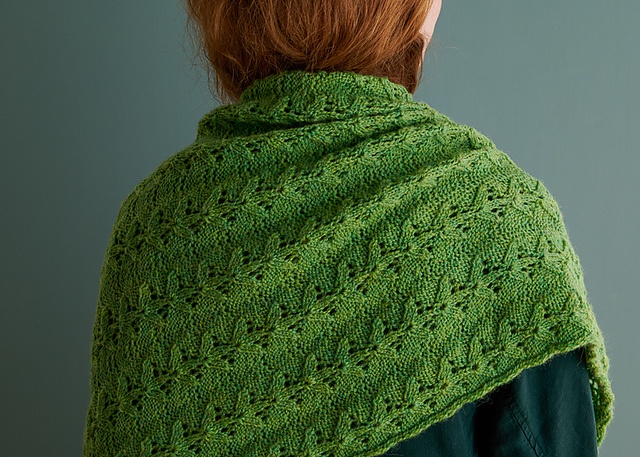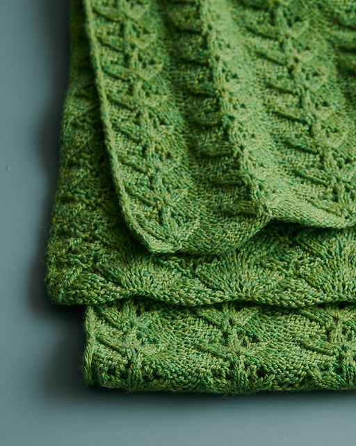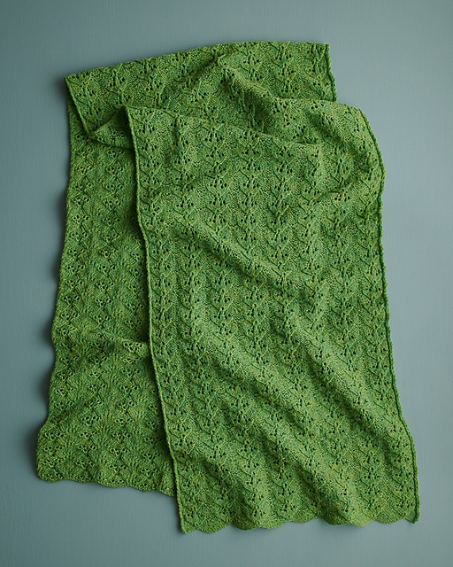 Dette tørklæde eller sjal præges af et smukt hulmønster med laurbærblade på en baggrund af glatstrikning. Bagsiden er også smuk og viser et viftemønster. Mønstret danner bølger i de korte ender.