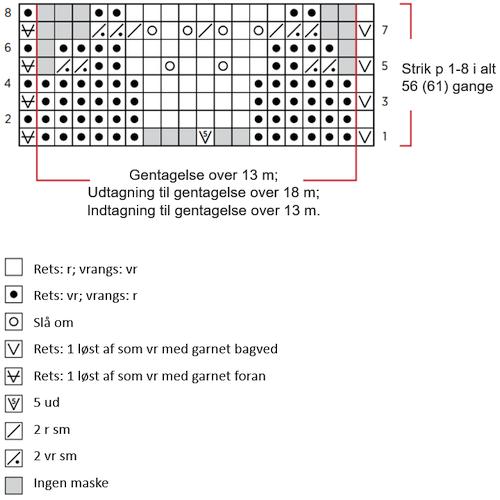 Bemærk: Til strikkeprøve anbefaler vi, at du slår 41 m op og strikker startpinden og derefter 5 gentagelser af de 8 mønsterpinde. Prøven kommer til at måle 16 cm i bredden og 14½ cm i højden efter blokning.