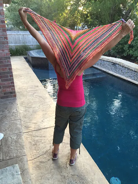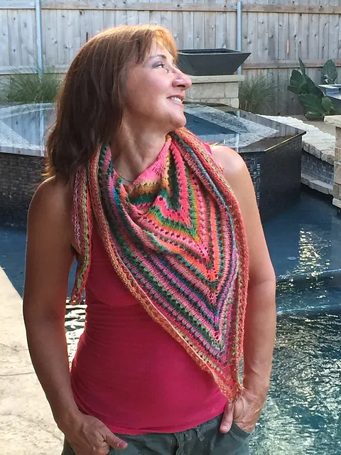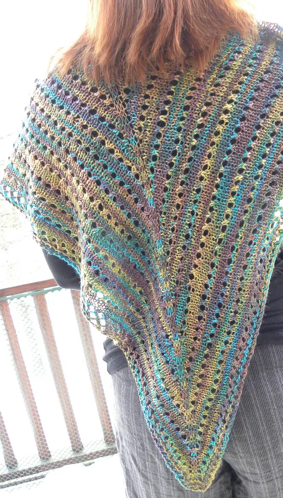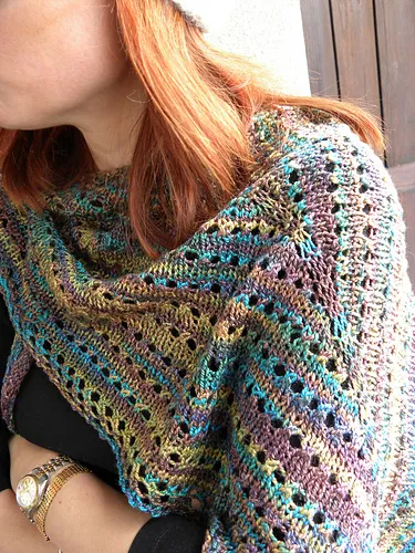 | Skønt sjal, som kan laves i netop den størrelse, du ønsker. Det er en enkel opskrift, og hulmønstret er ikke svært. Gør sig godt i farveskiftegarn. Her i merino med seacell på pinde 4 mm. |