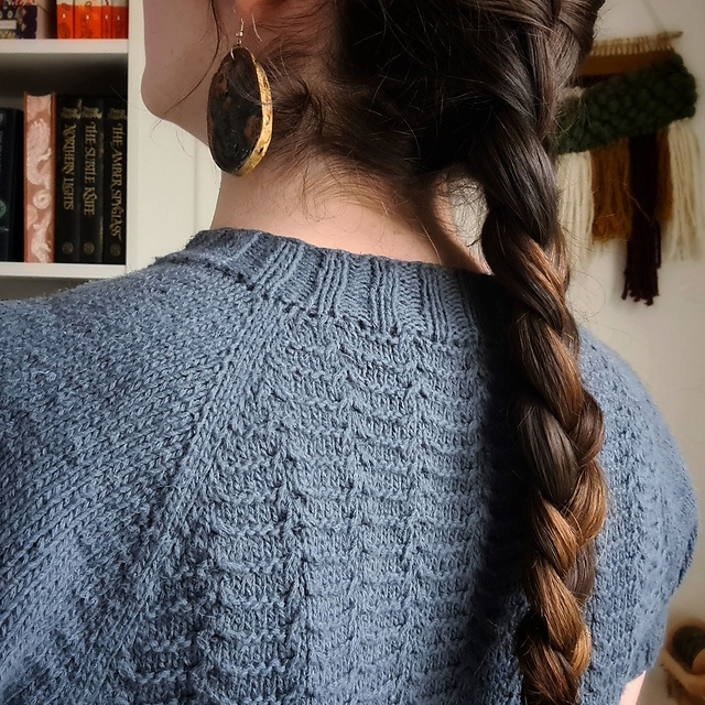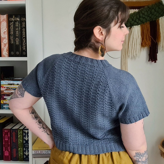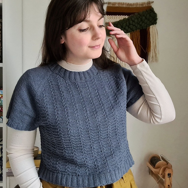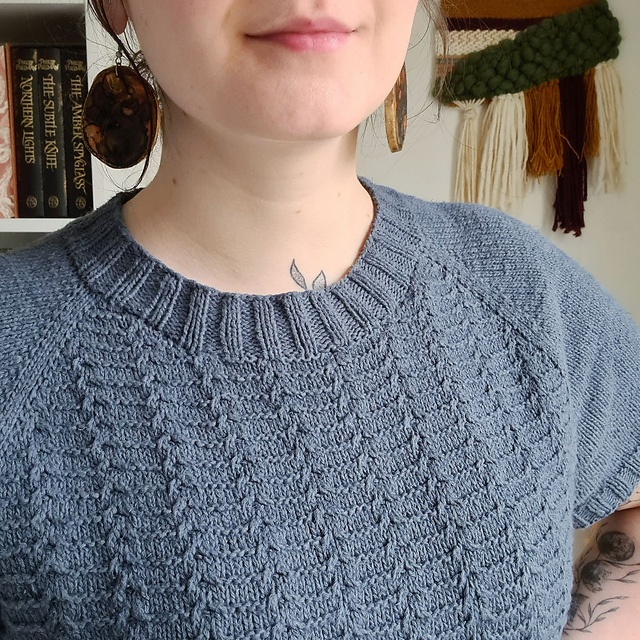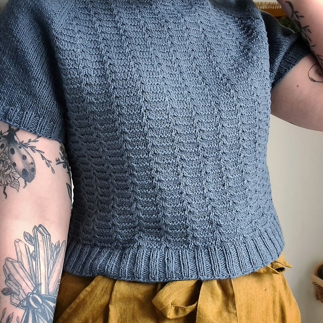 Sintara er en raglanbluse, der strikkes ovenfra. Den har et dækkende mønster på kroppen og små ærmer i glatstrikning.