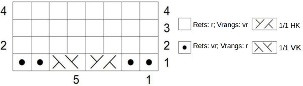- Venstre forstykke: 1 r, 1 ud venstre, 1 r, 4 vr, 1 ud højre.