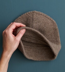© 2025 Purl Soho. Original titel Simply Hemmed Hat. Kun til personlig brug. Hverken opskrift eller færdigstrikket produkt må videresælges. Kontakt Purl Soho via Ravelry eller på www.purlsoho.com.