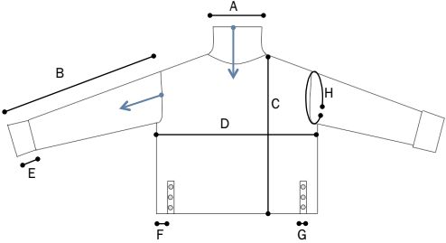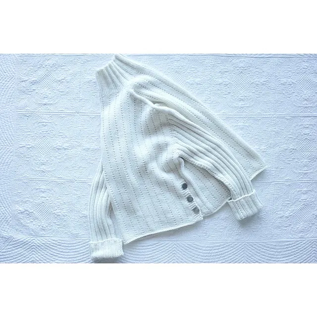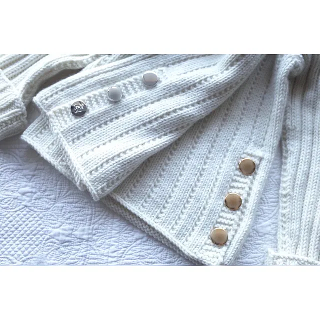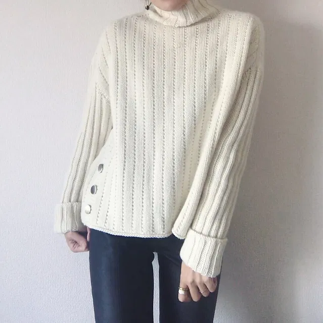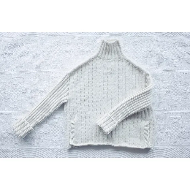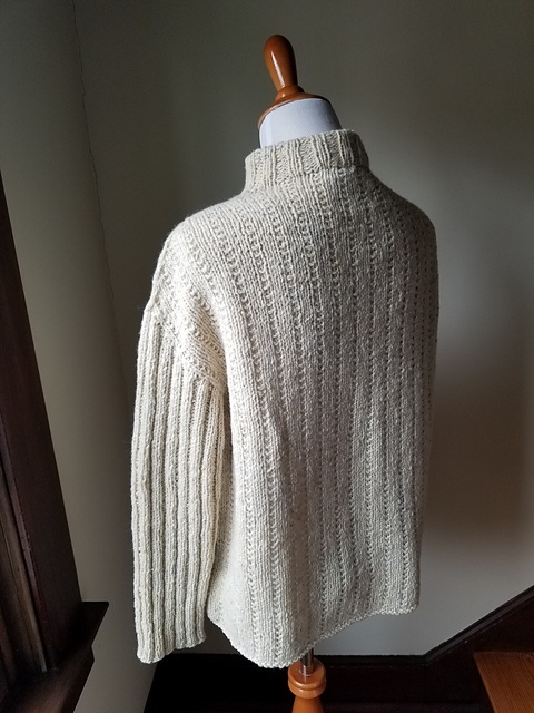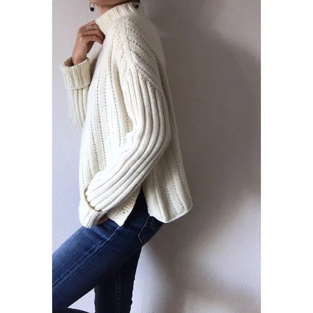 Denne sweater strikkes ovenfra. Du kan vælge mellem almindelig halsudskæring, høj hals og rullekrave. Der er slidser med 2 x 3 knaphuller, men du kan vælge at udelade dem.