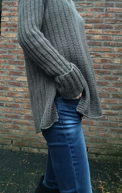 | Skøn, rummelig sweater, der strikkes ovenfra i 6 størrelser. Der er forslag til krave. Sweateren har valgfri slidser i siden med knapper. Her strikket i 100 % uld på pinde 5½ mm. |