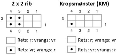 - Vendep 2 (vrangs): Lav DM, sæt markør, strik 10 m i rib 2 r, 2 vr, vend.
