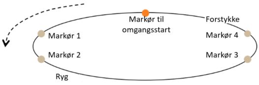 - Startp: Flyt MM, 15 (15, 15, 16, 16, 16) r, sæt markør 1, 3 r, sæt markør 2, 15 (15, 15, 16, 16, 16) r, 1 ud højre, 15 (15, 15, 16, 16, 16) r, sæt markør 3, 3 r, sæt markør 4, 13 (13, 13, 14, 14, 14) r, 1 ud højre = 2 m taget ud = 66 (66, 66, 70, 70, 70) m.