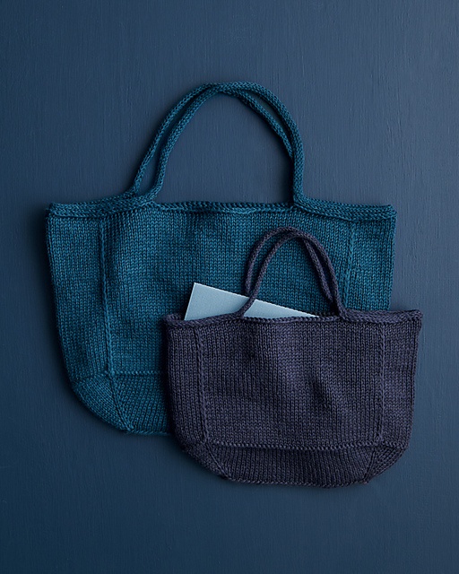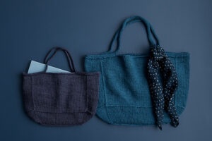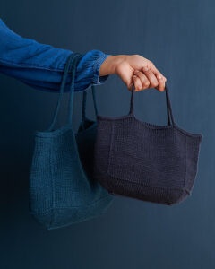 Purl Soho Blackbird Linen (100 % fransk hør; 160 m/100 g); light worsted/DK; garnforbrug i alt ca. 300 (520) m. Vi brugte mørkeblå til den lille taske og mørk turkis til den anden; 2 (4) ngl.