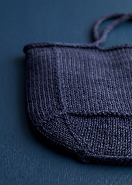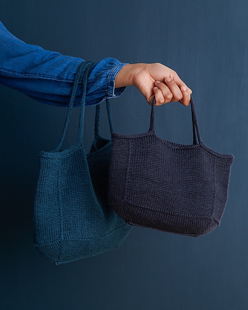 Du starter med bunden og former den med udtagninger i hjørnerne. Der er lodrette linjer med søjler i vævestrik, og en enkelt vrangpind skaber en stribe, der adskiller bunden fra kroppen. Langs den øverste kant laver du en fastgjort hestetømme til tasken, og du laver en løs hestetømme til hankene. Der er tykkere hanke på den store taske end på den lille.