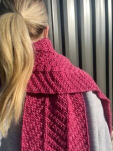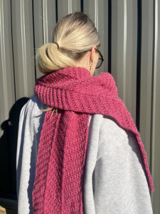 Tykt tørklæde med teksturmønstre, som er meditativ strikning. Dette er bare ret- og vrangmasker i forskellig rækkefølge. Mønstret er vendbart.