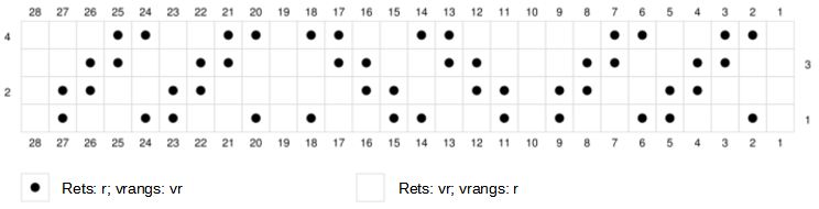 - P 4: (vrangs) *3 vr, 2 r, 2 vr, 2 r, 1 vr*, 2 r, 2 vr, 2 r, 2 vr. Gent fra * til *.