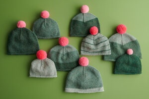 Lille hue i glatstrikning med pompon, strikket i uld med alpaca. Vi har lavet et bundt af garn med 9 farver til denne opskrift. Strik huer til hele familien i forskellige farver.