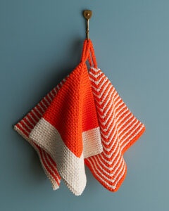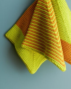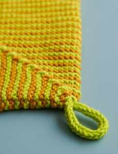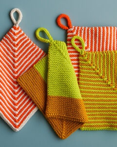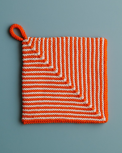 | Nemme, farvestrålende grydelapper strikket i retstrikning som dominofirkanter. De kan strikkes både med og uden striber. Her i 2 farver. Strikket i 100 % bomuld på pinde 3½ mm. |