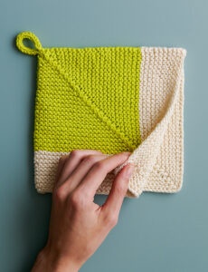 Denne grydelap er en almindelig dominofirkant, der strikkes rundt og bliver dobbelt, tyk og isolerende.
