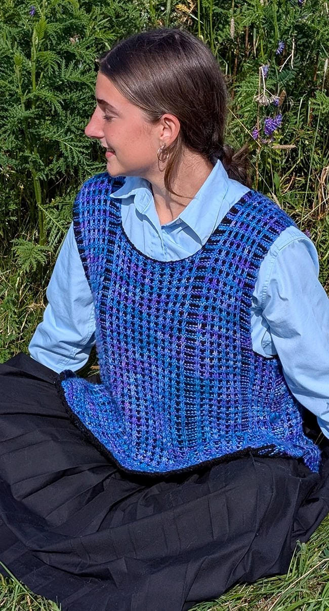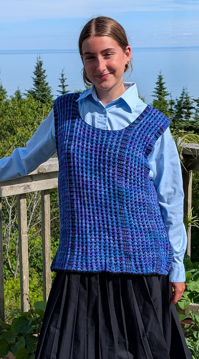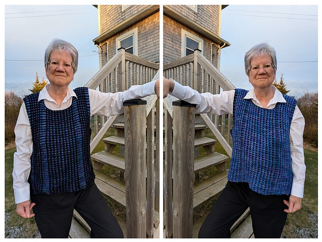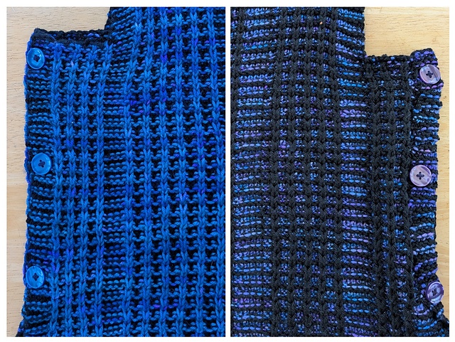 To-i-en-vest, som strikkes nedefra. På den ene side er der lodrette linjer i grundfarven i glatstrikning oven på en retstrikket bund. På den anden side er der lodrette linjer i kontrastfarven (se billede).
