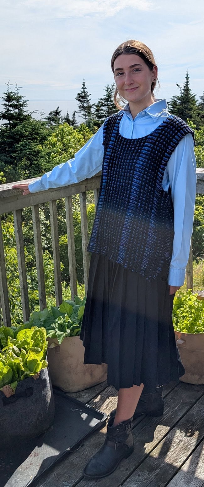 Vesten strikkes frem og tilbage på rundpind: 2 p i et enkelt vævestrikmønster med det ene garn, skub alle maskerne ned i den anden ende af pinden og strik 2 vævestrikpinde fra samme side med det andet garn. De retstrikkede kanter og indsatte striber strikkes undervejs.
