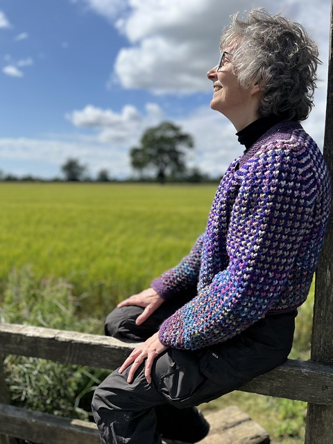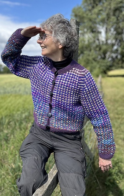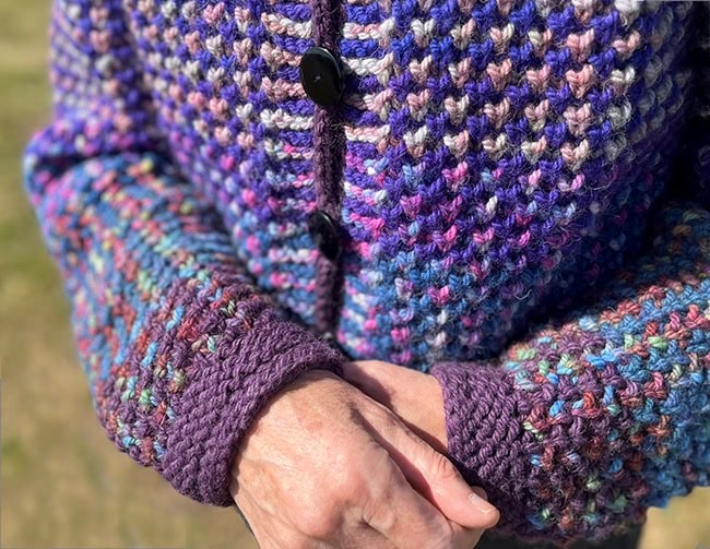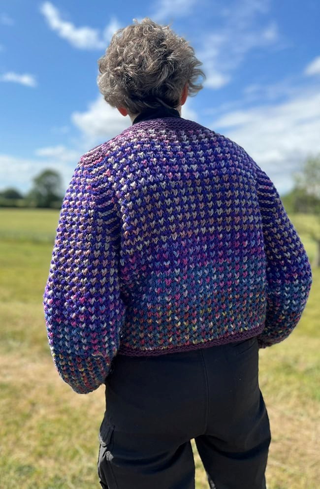 Den mangefarvede cardigan er strikket i Bluebell Yarns Texel Chunky, som er håndfarvet 3-ply worsted.